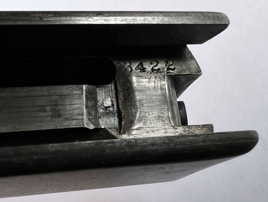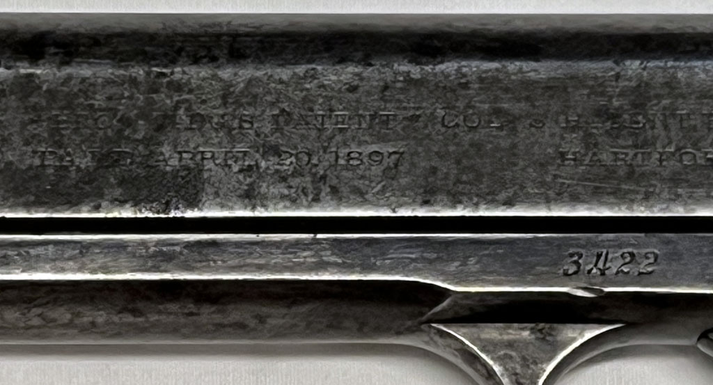 Browning's Patent - slide markings, serial number 3422 on left side of frame, above trigger.