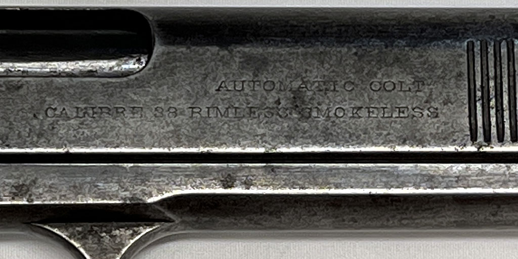 Right side slide inscription - "AUTOMATIC COLT" over "CALIBRE 38 RIMLESS SMOKELESS"
