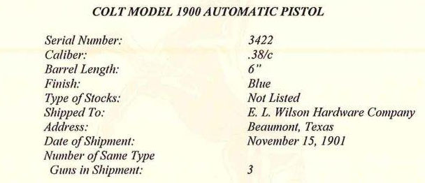 Model 1900 Sight Safety Altered Serial Number 3422 - This pistol is a middle variation of the Model 1900 with front plunge milled serrations, high polish blue, high spur hammer and factory sight safety. Gun was one of a shipment of three to E.L. Wilson Hardware Company in Beaumont, Texas on November 15, 1901.  This pistol is the highest serial number encountered to date for an original sight safety configured Model 1900.