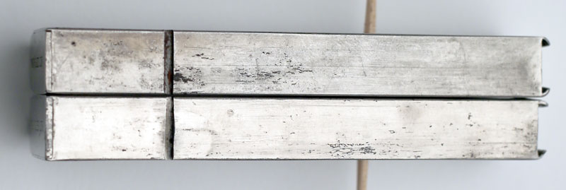 Type I and Type II Colt Automatic Model 1900 Pistol Caliber .38 Rimless Smokeless - Type I magazines (top) were flat above the groove in the back of the magazine.  Type II magazines (bottom) had a small raised hump area above the groove in the back of the magazine.  This transition took place approximately at serial number 3,000.