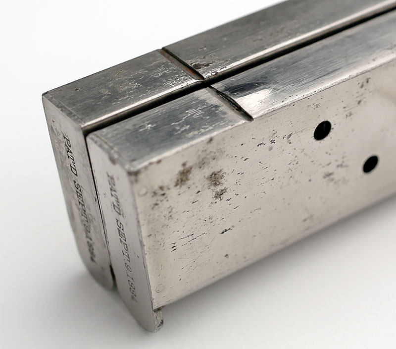 Type I and Type II Colt Automatic Model 1900 Pistol Caliber .38 Rimless Smokeless - Type I magazines (rear) were flat above the groove in the back of the magazine.  Type II magazines (front) had a small raised area above the groove in the back of the magazine.  Both are full nickel plated (with nickel plated followers) and marked "PAT'D SEPT. 9. 1884" on the base plate.