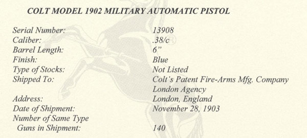 Factory letter indicates that this pistol was shipped on November 28, 1903 to Colt's Patent Fire-Arms Mfg. Company, London Agency, London England.