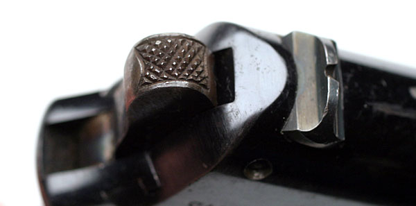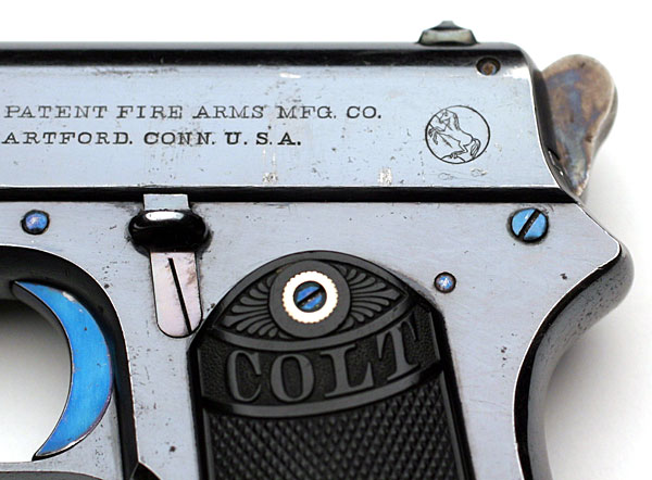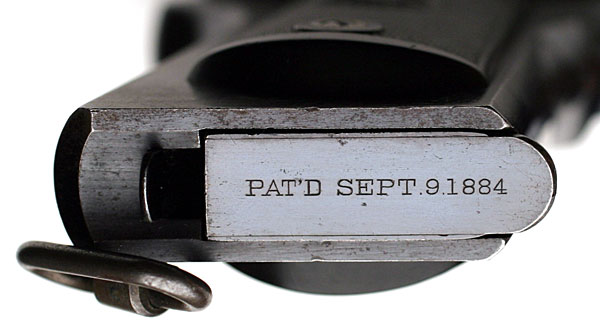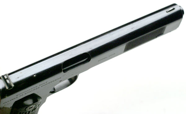 The September 9, 1902 patent covered several features, but the most significant improvement was the slide lock device.  The concept surrounding this John Browning designed modification was utilized by Browning in the design of the Model 1911.  The split slide locks were used to create tension on the groove in the frame.  This variation was used until early 1907.  Notice the two tiny British proof marks on the slide under the Rampant Colt.  These proofs do not appear on the frame or barrel.