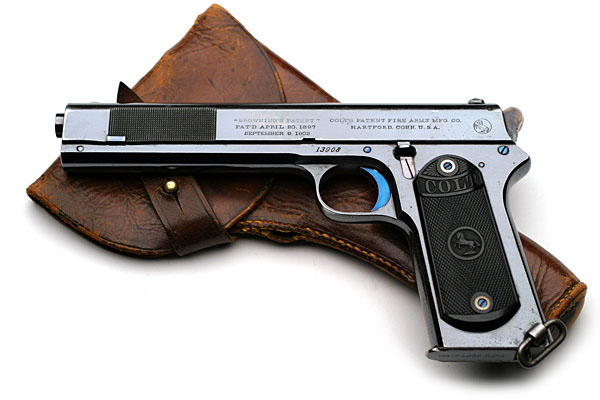 The takedown hole (which was no longer needed to disassemble the gun due to the modifications as specified in John Browning's September 9, 1902 patent) remained as part of the standard machining process at Colt until late 1908.