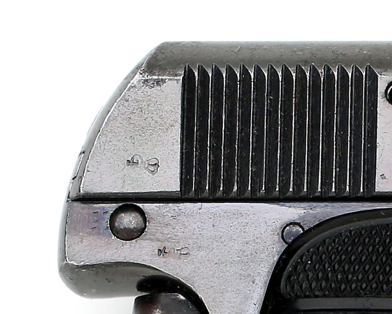 Colt Model 1908 Vest Pocket .25 ACP serial number 1342 - One of the earliest examples encountered with British proof marks.  Proof marks are located on the left rear slide (above the thumb safety lever), on the left rear frame (to the right of the thumb safety lever) and on the barrel, visible through the ejection port. This pistol was shipped on February 2, 1909 to Colt's Patent Fire-Arms Mfg. Co, London Agency, London, England in a 25 gun shipment.