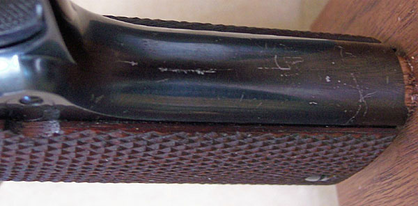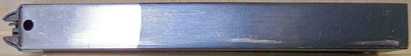 Left side view.  Notice the semi-circle localized hardening mark around the groove to hold open the slide.