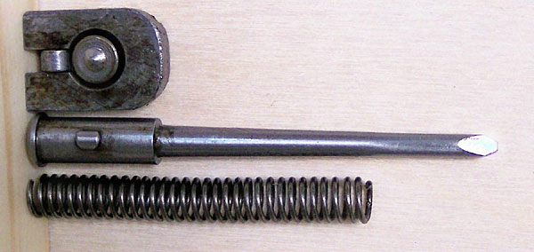 Firing assembly from top to bottom:  Firing pin stop, firing pin and firing pin spring.