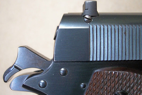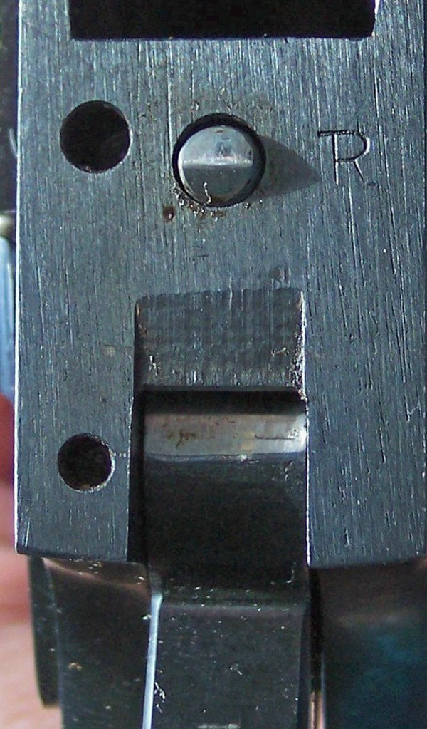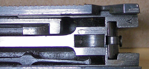 Close-up of underside of slide.  Notice how firing pin stop of the Ace model has a roller on the bottom.