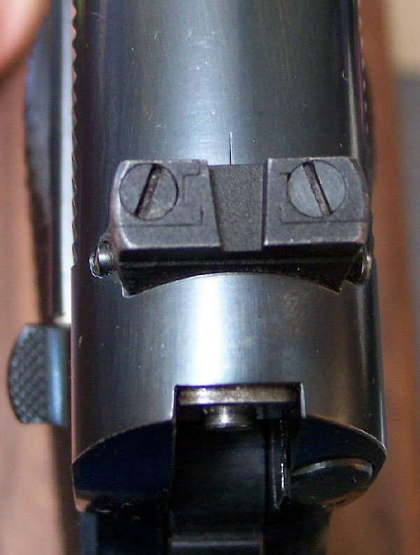 "CAUTION - When adjusting Ace rear sight, care should be taken not to raise sight leaf (A) above top graduation line (B) on base. Tension of the threaded elevating screw (C) may be lost by careless adjustments and the effectiveness of the sight destroyed"