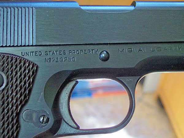The initials of Major Charles S. Reed (C.S.R.), Officer in Charge of Outside Inspection, were stamped on all M1911A1 pistols manufactured in 1940, signifying government acceptance of the pistol.  His initials were stamped on the left side of the receiver below the slide stop in accordance with Ordnance drawings.  The initials C.S.R.  were also stamped on the top of the receiver near the disconnector hole to indicate provisional inspection, replacing the previous letter "R" within an oval.