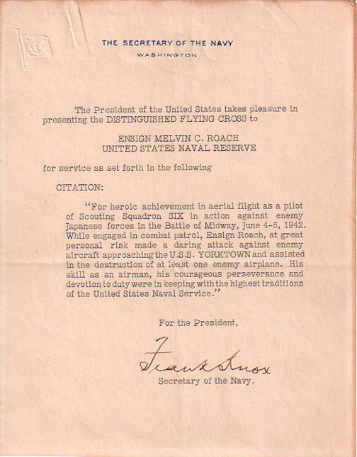 Original Distinguished Flying Cross citation presented to Ensign Melvin C. Roach, United States Naval Reserve signed by Secretary of the Navy Frank Knox.  The Citation reads as follows: "For heroic achievement in aerial flight as a pilot of Scouting Squadron SIX in action against enemy Japanese forces in the Battle of Midway, June 4-6, 1942.  While engaged in combat patrol, Ensign Roach, at great personal risk made a daring attack against enemy aircraft approaching the U.S.S. YORKTOWN and assisted in the destruction of at least one enemy airplane.  His skill as an airman, his courageous perseverance and devotion to duty were in keeping with the highest traditions of the United States Naval Service."