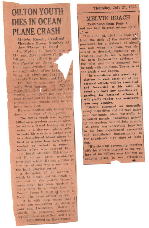 July 27, 1944 - Newspaper article of Lt. Melvin Roach's death.
