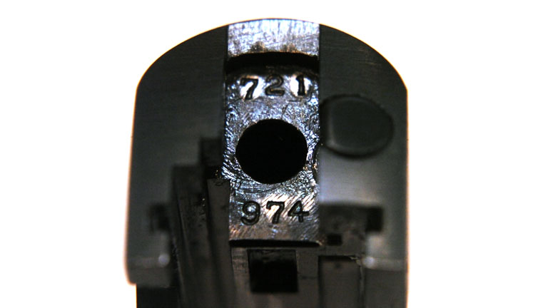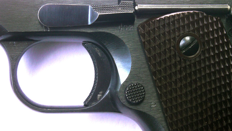 The initials of Major Charles S. Reed, Officer in Charge of Outside Inspection, were stamped on all M1911A1 pistols manufactured in 1940 and partially into 1941, signifying government acceptance of the pistol.  His initials were stamped on the left side of the receiver below the slide stop in accordance with Ordnance drawings.