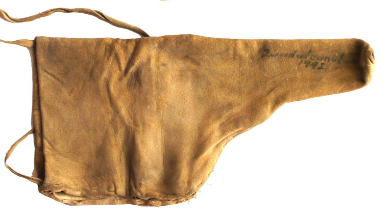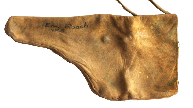 Period Storage Pouch: left and right side of leather pouch gun was stored in for over 70 years. "Ensign Roach VF 5" on one side.