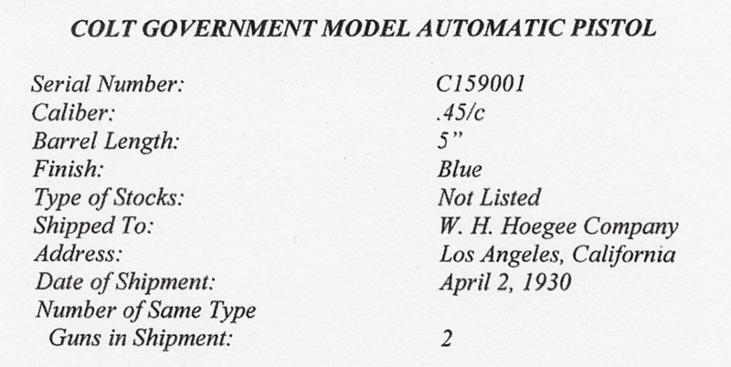 Colt letter indicates it was shipped with one other gun to W. H. Hoegee Company, Los Angeles, California on April 2, 1930.