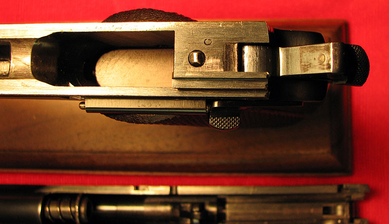 This pistol lacks the Swartz Safety, which despite being serial numbered in the range of Colt Government Models that shipped with this safety device, is normal for the Brazilian Contract pistols.  This pistol has a “G” next to the disconnect on the frame indicating it is a left over or reclaimed rejected military frame (without the heart shaped protrusions under the stocks). The serial number on the slide and frame match and the barrel has an “S” in front of the lugs. The magazine is a full blue pin connected with the COLT 45 AUTO marked base.