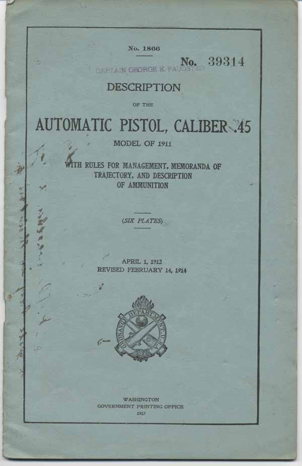 Colt Model of 1911 U.S. Army .45 ACP - No. 1866 Description of the Automatic Pistol, Caliber .45, Model of 1911, Serial Numbered edition No. 39314, Issued to Captain George E. Faugsted