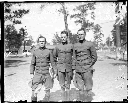 Captains, Samuel Slawitsky, Leon Cutter, and George Faugsted, 122nd Artillery, standing together at Camp Logan in Houston, Texas