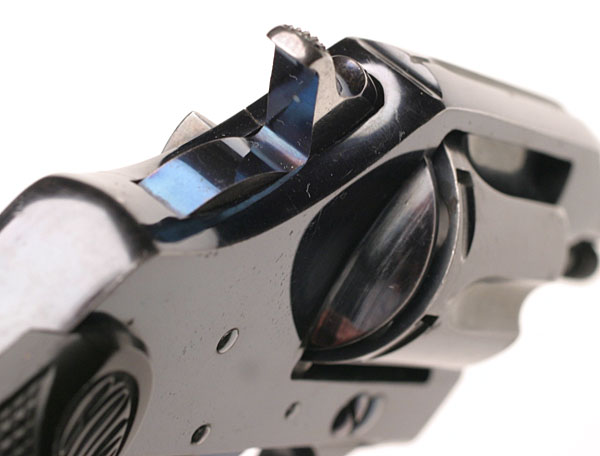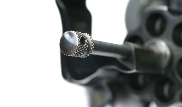 Close-up view of top of frame and top of hammer. Hammer is hand
