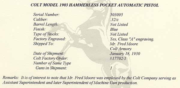 The factory letter confirms the engraving as Class "A" but does not list the mother of pearl grips.  This pistol was shipped on January 18, 1930 to Mr. Fred Moore at the Colt Armory in a single gun shipment and was processed on Colt Factory Order Number 17702/1.  The letter includes a remark:  "It is of interest to note that Mr. Fred Moore was employed by the Colt Company serving as Assistant Superintendent and later Superintendent of Machine Gun production."