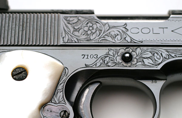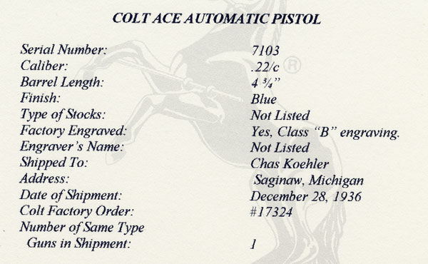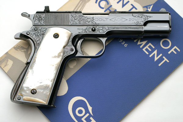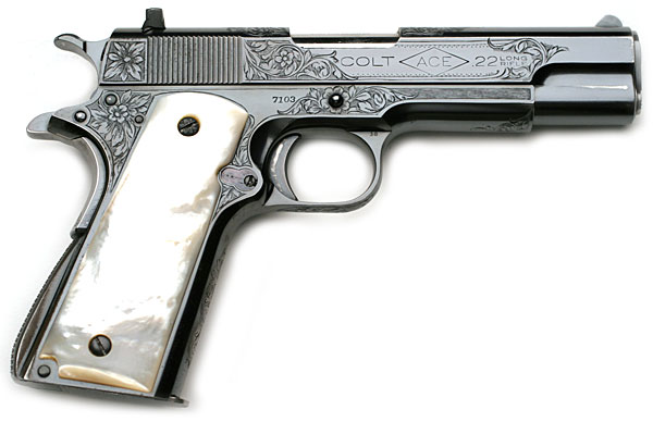 Colt ACE .22 LR serial number 7103 (manufactured in 1936 and shipped December 28, 1936) - Blue finish with mother of pearl grips and factory "B" engraved coverage from the shop of Colt master engraver Wilbur Glahn.  The mother of pearl grips were not listed in the factory letter.  This pistol was a single gun shipment to Chas Koehler of Saginaw, Michigan on December 28, 1936.  It was processed on Colt Factory Order number 17324.