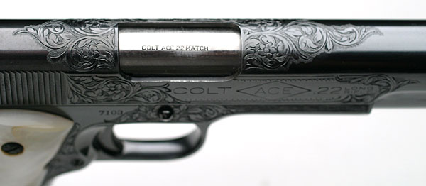 Top/right close-up profile of engraving on slide.  Notice how the barrel is marked "COLT ACE 22 MATCH" visible through the ejection port.