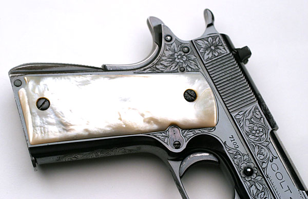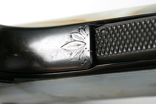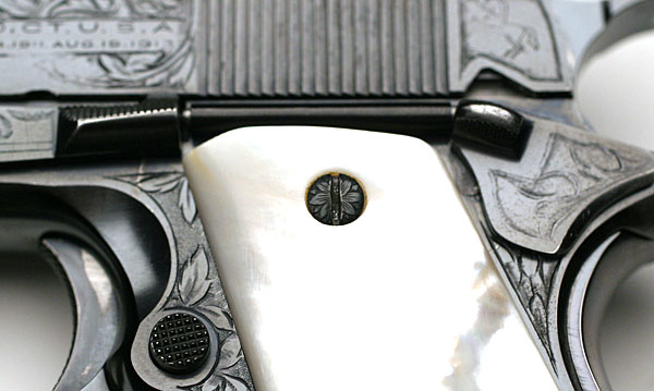 Left side view of slab mother of pearl grips.  Notice the combination of engraved and plain grip screws.