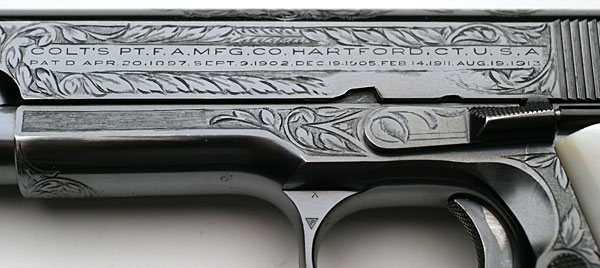 Engraving style is similar to Wilbur Glahn engraved Colt National Match serial number C163995 which is pictured on Volume II, page 599 of the Book of Colt Engraving. It also shares similar engraving style characteristics with Colt Government Model, serial number C147731, pictured on page 603 of the same book.