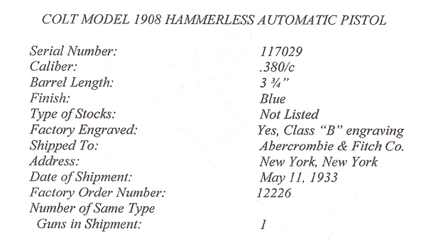The factory letter describes this pistol as having a blue finish, stocks not listed, factory engraved and shipped to Abercrombie & Fitch, May 11, 1933, New York, NY as a single gun shipment on Colt factory order number 12226. (see letter below):