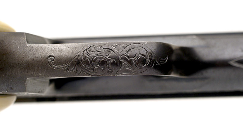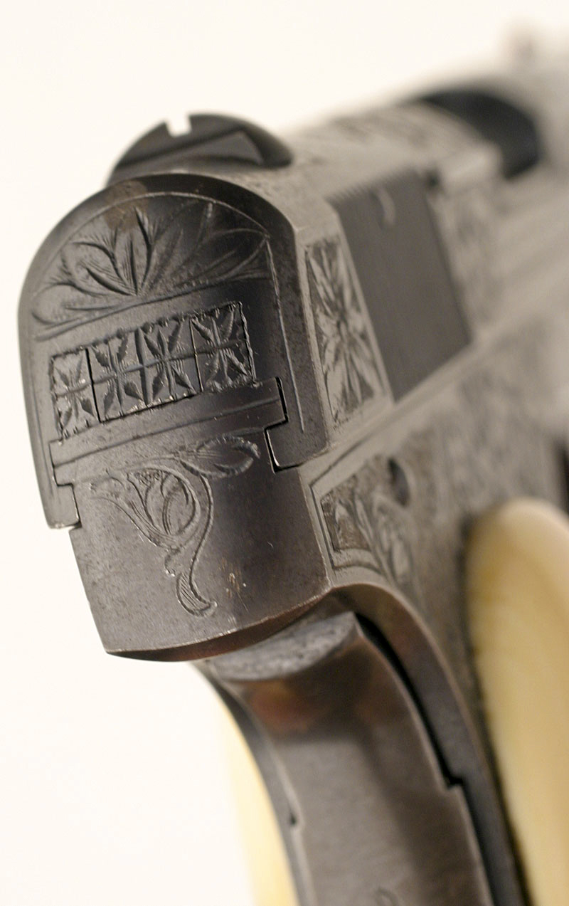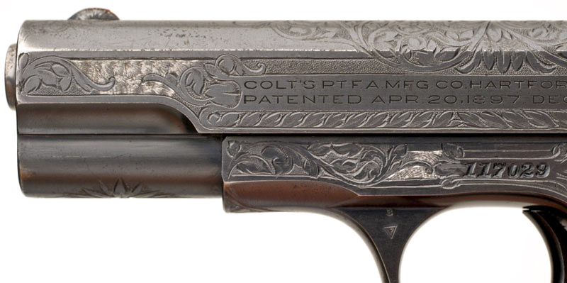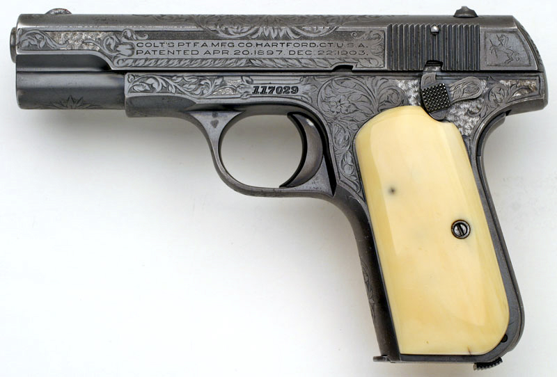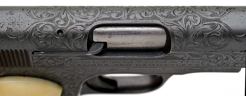 Colt 1908 Pocket Hammerless .380 ACP serial number 117029 - A very unique example with an unusual engraving pattern.  This work is believed to have been done by Colt factory master engraver Wilbur Glahn. This pistol has factory "B" coverage, but what makes it most unusual is the engraving treatment on seven areas of the finish. In these areas, the engraving is cut through the blue in order to give the gun the appearance of having engraved silver or platinum inlays.  This pistol is also fitted with beautiful period plain ivory grips.