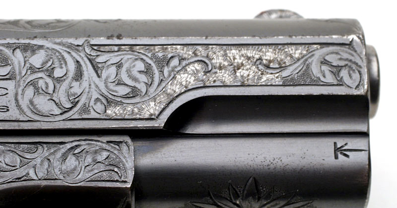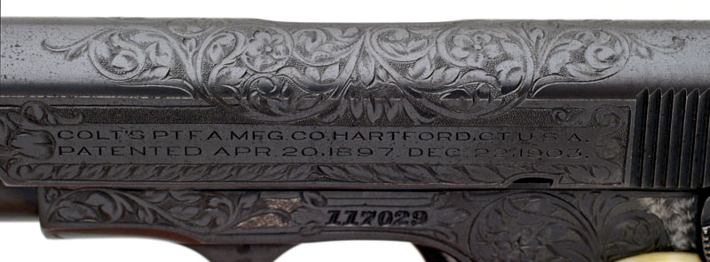 Colt 1908 Pocket Hammerless .380 ACP serial number 117029 - close-up of left side of slide showing engraving cut through the blue on the slide and to the left of the serial number.  Notice how the engraved leaves that enter the white engraved areas have a blued finish.