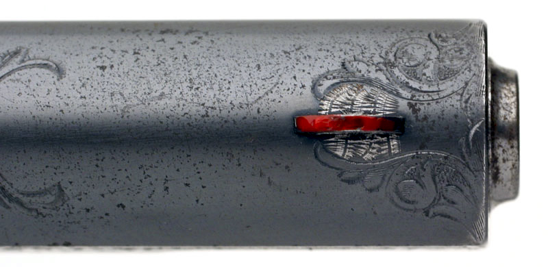 Close-up of the right side of the slide.  Notice how the area around the front sight and the front sight is engraved.  The front site is factory -- the red paint on the front sight was applied by a previous owner.