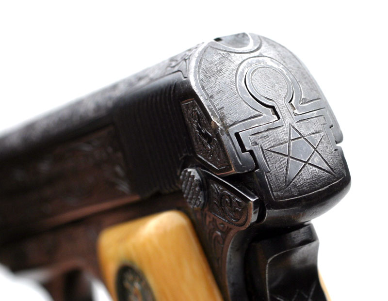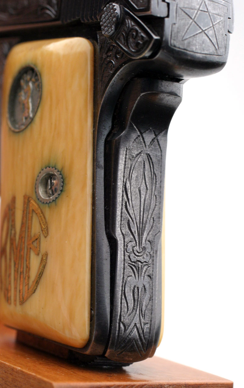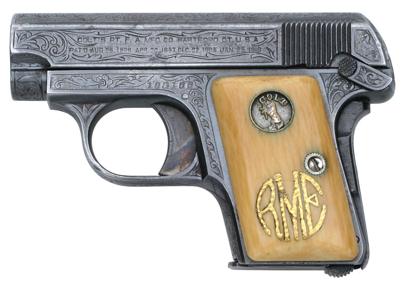 Colt 1908 Vest Pocket .25 ACP Serial Number 163166 Factory Master Engraved by William H. Gough Blue Finish, Gold Inlaid Monogrammed Ivory Stocks - The records indicate this pistol was shipped out as a .25/c, 2", in the Green state for engraving. It was shipped to A.H. Fox Gun Co. in Philadelphia, PA for William H. Gough on April 20, 1917, a shipment of 1 gun. For other factory engraved Colt 1908 Vest Pocket .25 ACP pistols by William H. Gough, See: Gun of the Month - December 1998 Gun of the Month - January 2003 Gun of the Month - September 2009 Gun of the Month - January 2010
