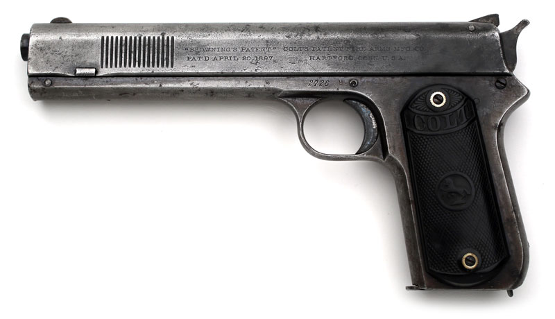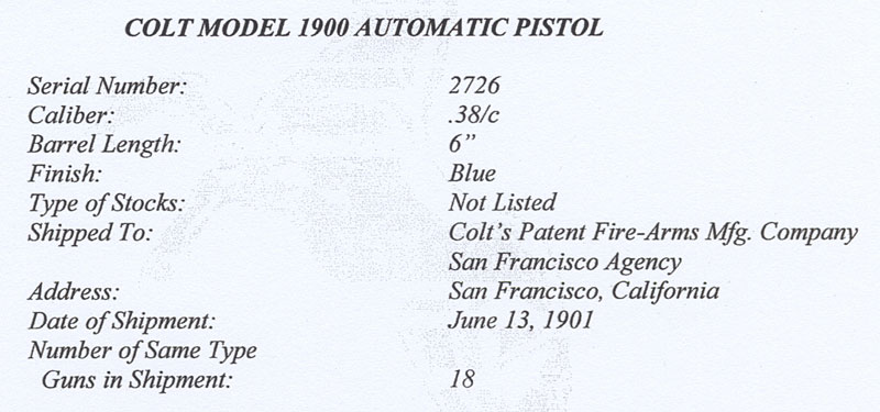 Model 1900 Sight Safety Altered Serial Number 2726 - This pistol is an early middle variation of the Model 1900 with front plunge milled serrations, high polish blue, high spur hammer and original sight safety. Later hard rubber stocks post dated smooth walnut stocks. Pistol was shipped to Colt's Patent Fire-Arms Mfg. Company, San Francisco Agency, San Francisco, California on June 13, 1901 in a shipment of 18 guns.