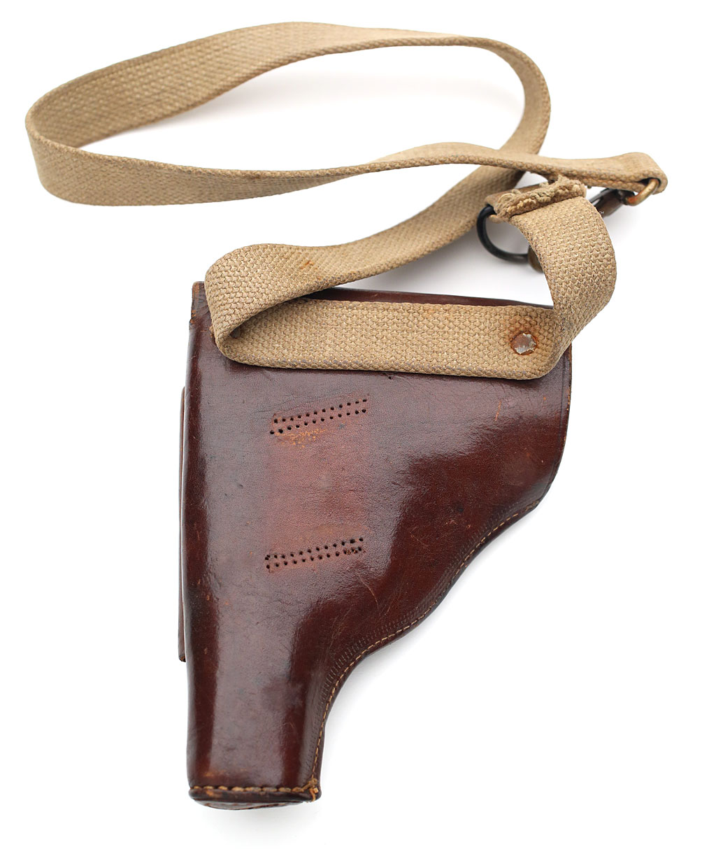 Colt 1903 Pocket Hammerless .32 ACP serial number 318150 - rear view of shoulder holster showing where belt loop was removed and olive drab canvas strap was added.