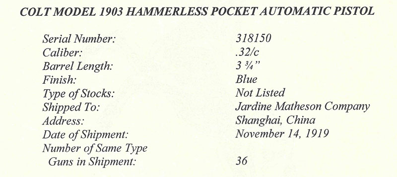 Colt 1903 Pocket Hammerless .32 ACP serial number 318150 - One of 36 pistols shipped to Jardine Matheson Company, Shanghai, China on November 14, 1919.  Pistol has a blue finish and Colt hard rubber stocks.  Accompanying this pistol is brown leather British flap holster that's been converted from a hip holster to a shoulder holster.