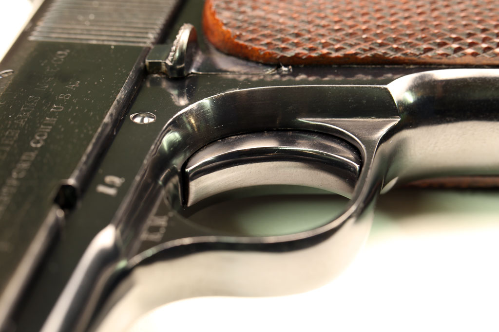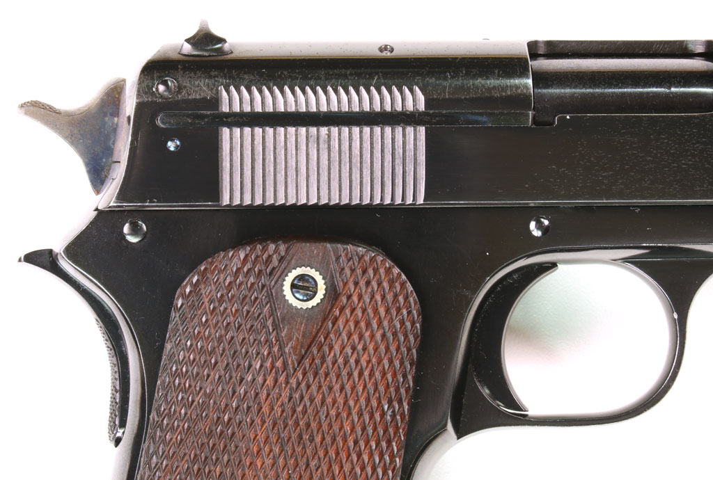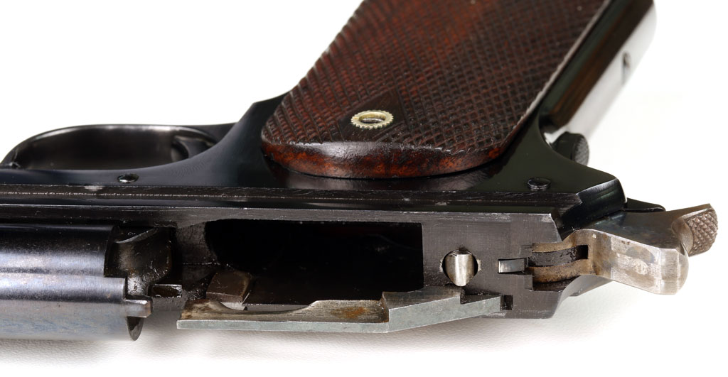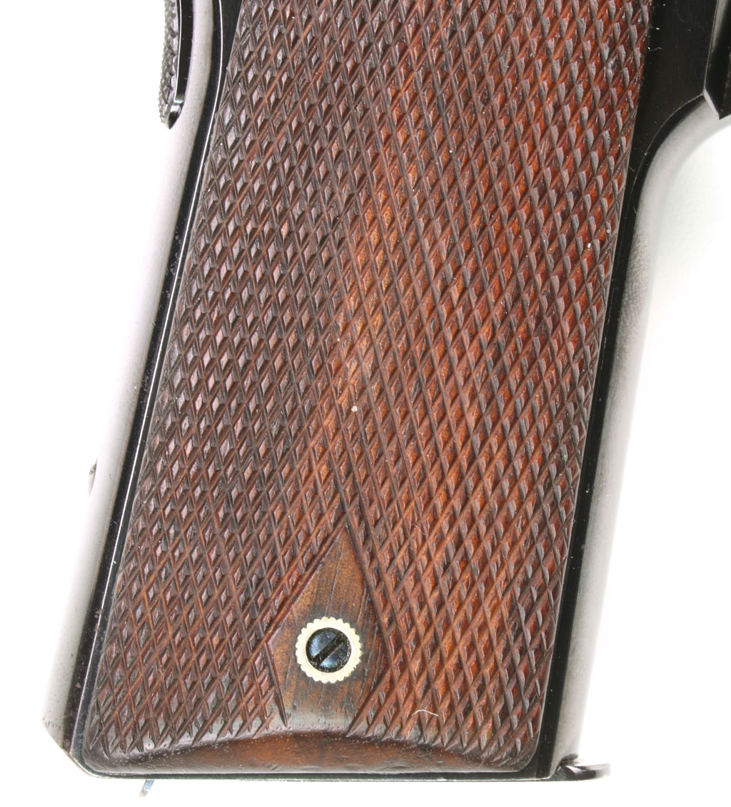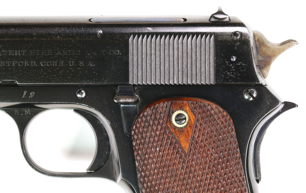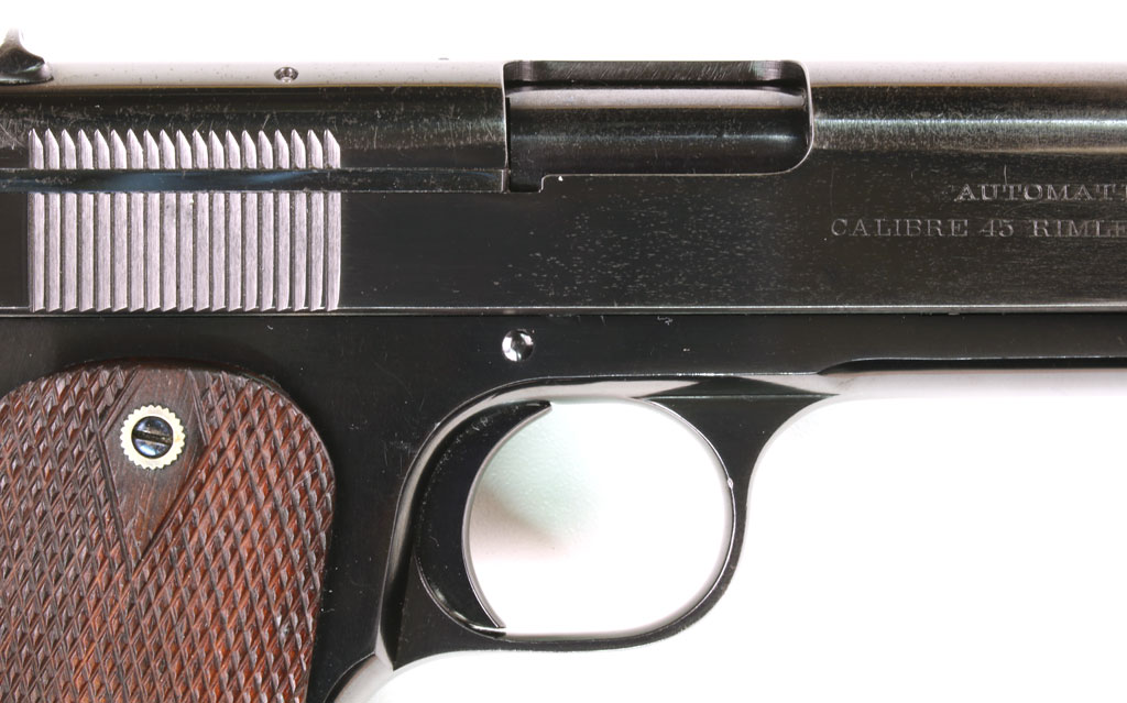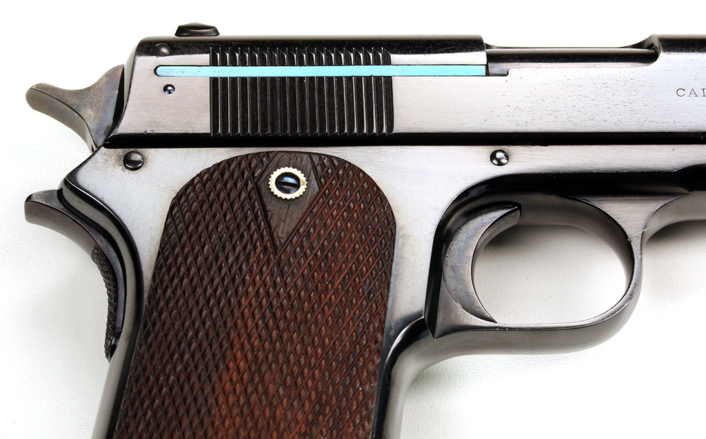 Model 1907 Military Serial Number 19 - 200 .45 cal. No. 1 -200 (inclusive) Modified hammer, Nearly vertical ejection. Auto Indicator to show that chamber is loaded, Auto safety, Strengthened stirrup, and Lengthened trigger stirrup pin. Shipped to the U.S. Government, Springfield Armory, March 17, 1908