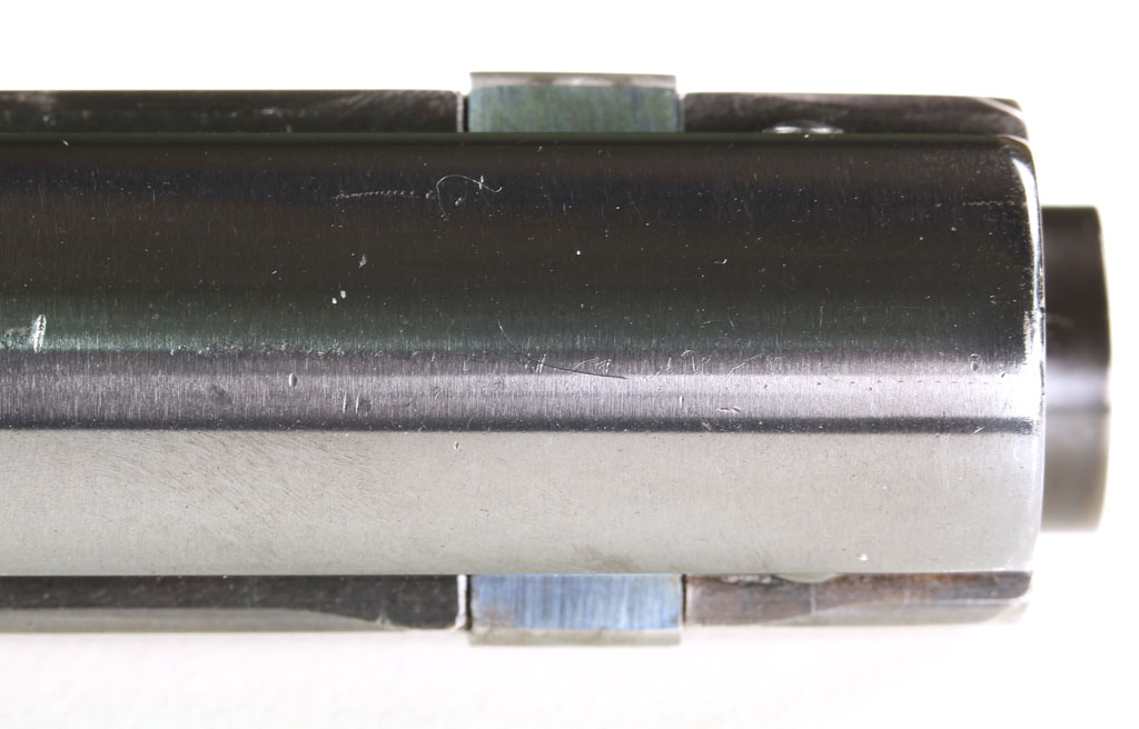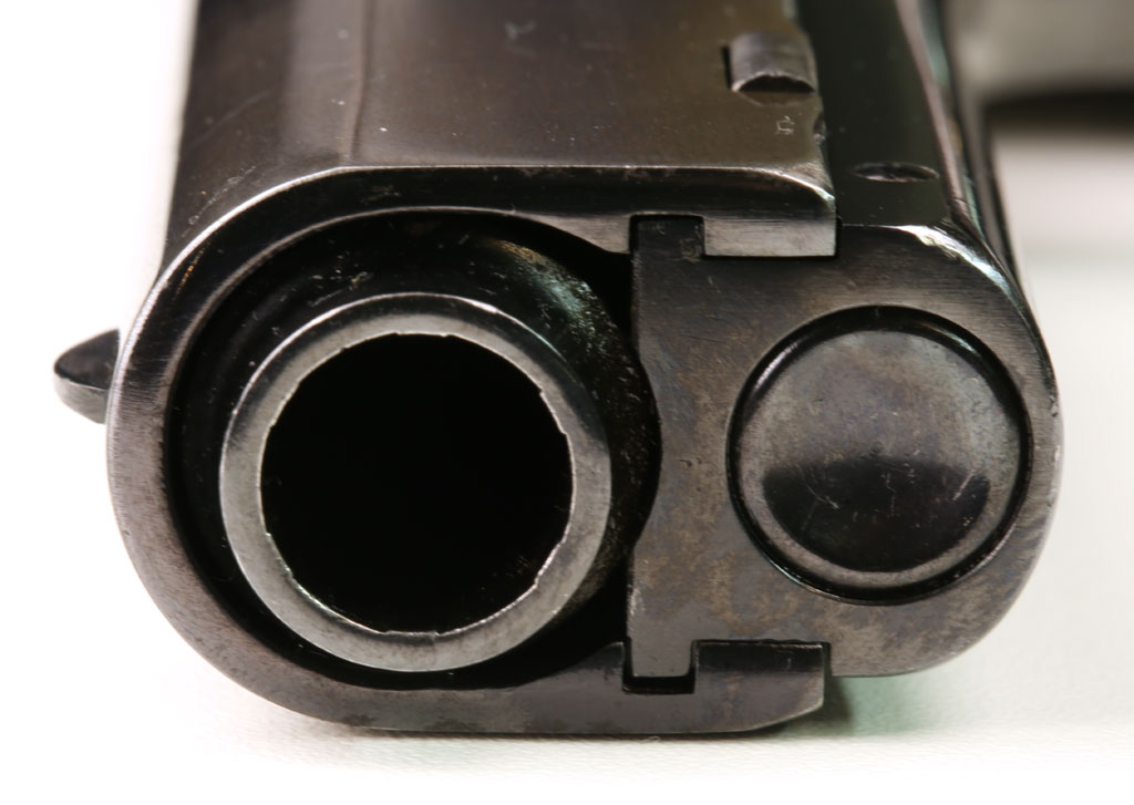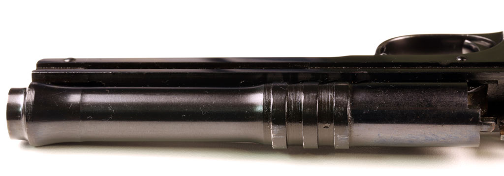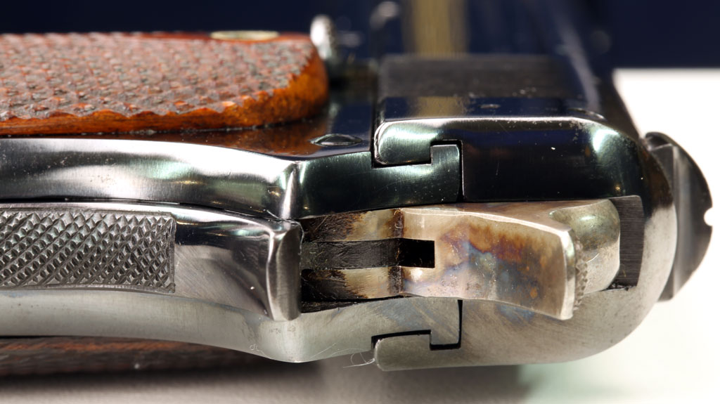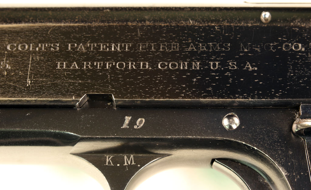 Left side of Model 1907 sn 19.  Note the grip safety and lanyard loop.  A single officer presided over the inspection of the Model 1907 Contract pistols.   All of the pistols bear the initials "K.M." for Major Kenneth Morton.  These initials are hand stamped into the upper leg of the trigger guard on the left side.  Major Morton assumed the post in April 1907 and acted as the inspecting and accepting officer throughout the fiscal year 1907 - 1908.