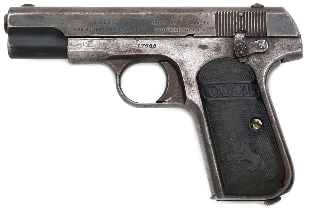 A well worn Colt Model 1908 Pocket Hammerless .380 ACP serial number 17655 - factory roll marked "P.D.N.Y. No. 811" on right side of frame above stock. ( Left stock is a later style Type III.) Over 800 of these pistols were ordered by the New York City Police Department for issue to detectives. This is one of the last ones shipped and is the highest number I've encountered.