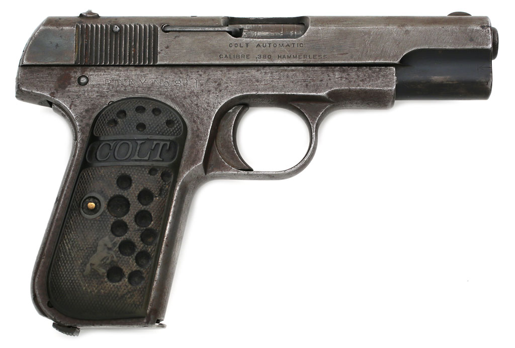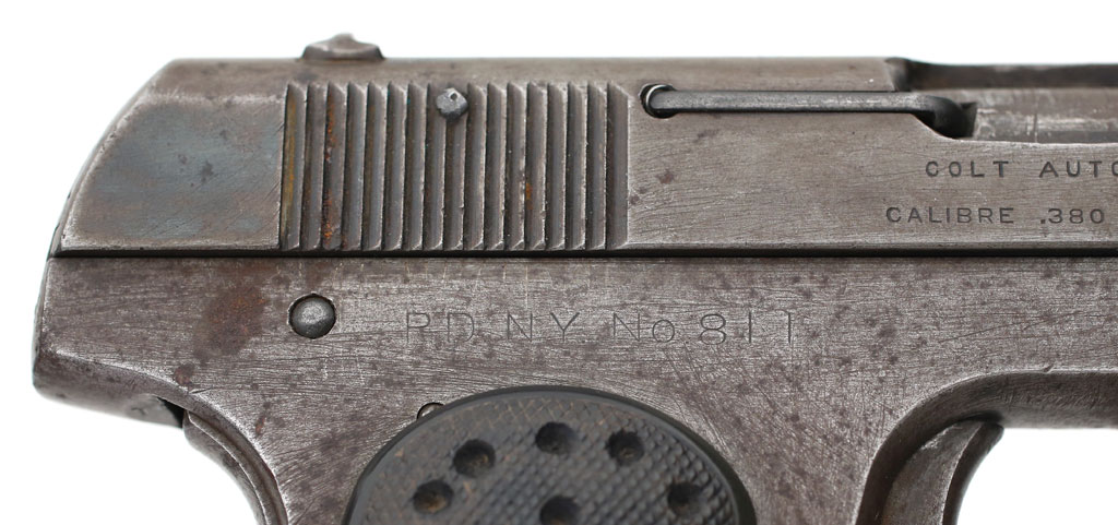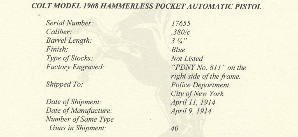 Colt 1908 Pocket Hammerless .380 ACP serial number 17655 Factory Letter - Date of manufacture April 9, 1914, Factory Engraved "PDNY No. 811" on the right side of the frame. Shipped to Police Department, City of New York, April 11, 1914, 40 guns in shipment. Prior to ordering these Colt pistols, the New York Police Department issued to its officers Colt New Police .32 revolvers that were factory engraved with the inscription "New York Police" on the back strap.