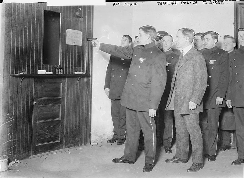 The man in the photograph who is not in uniform is Alfred P. Lane, Olympic shooter and gold medalist. Lane was hired by the New York City Police Department (NYPD) in 1914 to train police officers how to shoot with the new semi-auto Colt 1908 Pocket Hammerless .380 caliber pistols. Photo is dated March 16, 1914. Source: George Grantham Bain Collection (Library of Congress).