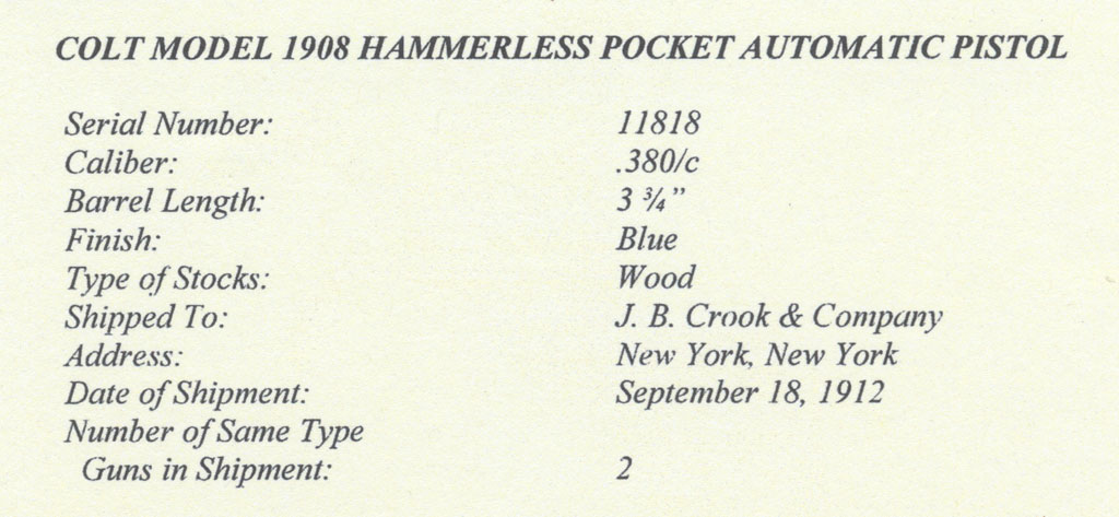 Colt Model 1908 Pocket Hammerless .380 ACP serial number 11818 - blue finish with factory "plain wood stocks".  Pistol was one of two .380s shipped to J.B. Crook Co., New York on September 18, 1912 with smooth walnut stocks accompanying three 1903 .32 and three 1908 Vest Pocket .25 pistols all of which had these same stocks.