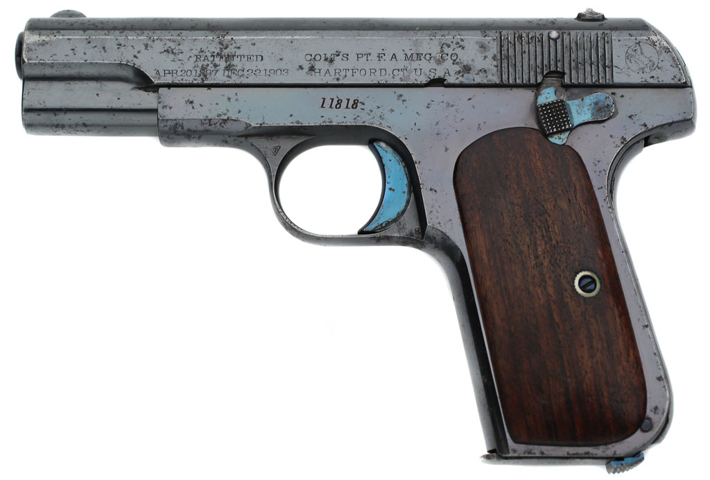 Colt Model 1908 Pocket Hammerless .380 ACP serial number 11818 -shipped from the factory with "plain wood stocks" right side view.