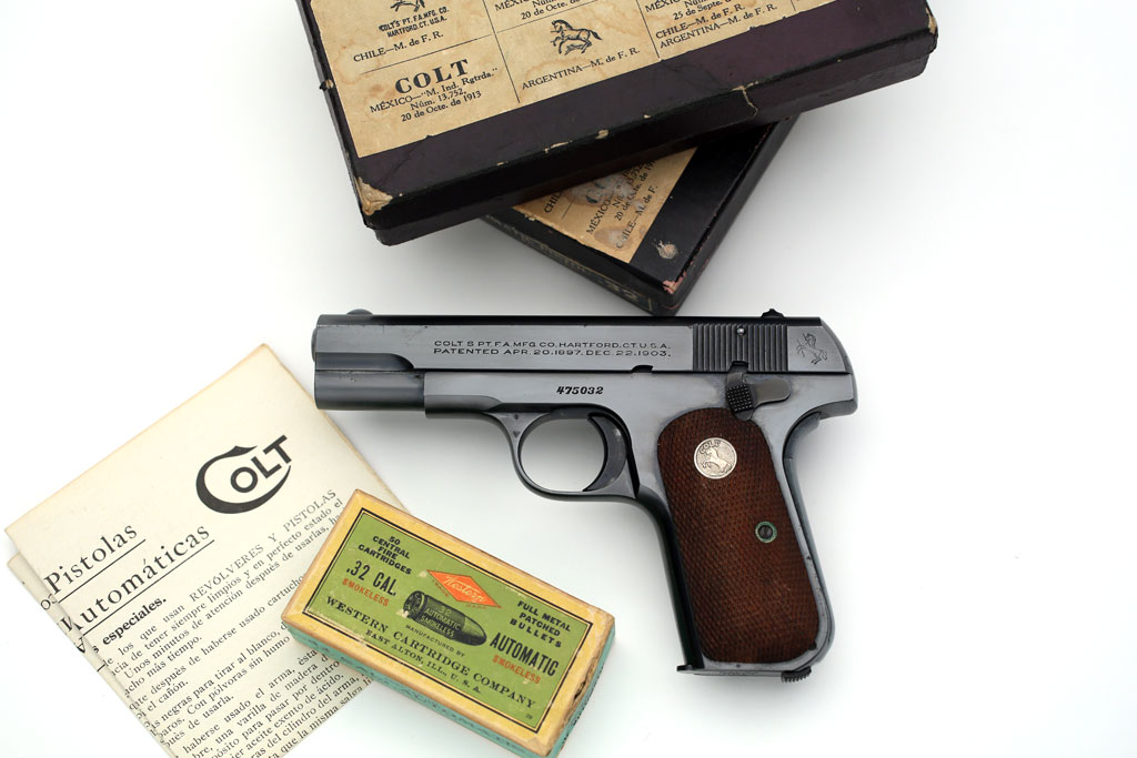 Colt Model 1903 Pocket Hammerless .32 ACP serial number 475032 - Pictured with the original box, Spanish instructions and a period box of Western Cartridge .32 ACP ammo that accompanied the pistol. Also pictured is a second box with South American label, a slight variation that includes the country of Argentina.