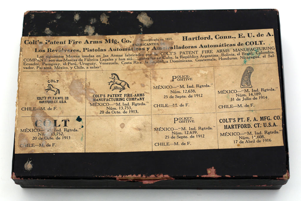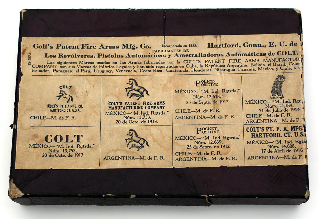 Colt Model 1903 Pocket Hammerless .32 ACP box for serial number 506600 - South American label (S-59R), Argentina added.
