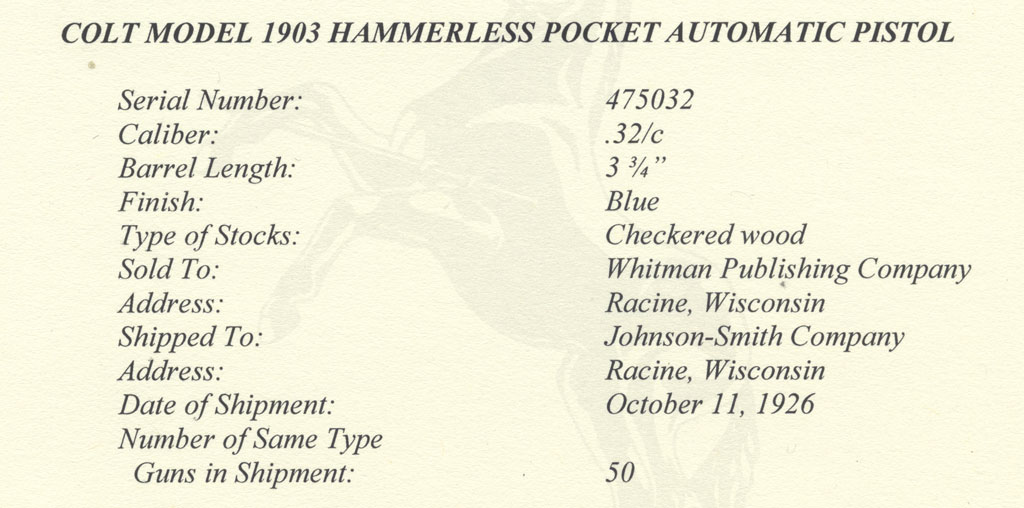Factory letter indicates this pistol was sold to Whitman Publishing Company, Racine, Wisconsin with blue finish and checkered wood stocks and shipped to Johnson-Smith Company, Racine, Wisconsin on October 11, 1926. It was one of 50 in the same shipment.