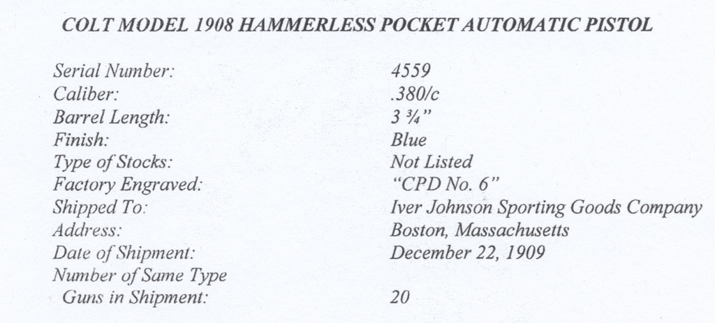 Colt 1908 Pocket Hammerless .380 ACP serial number 4559 factory inscribed "C.P.D. No. 6" on grip safety. This was one of 20 guns marked "C.P.D. No. 1-20" on the grip safety shipped to the Chicopee, Massachusetts Police Department.