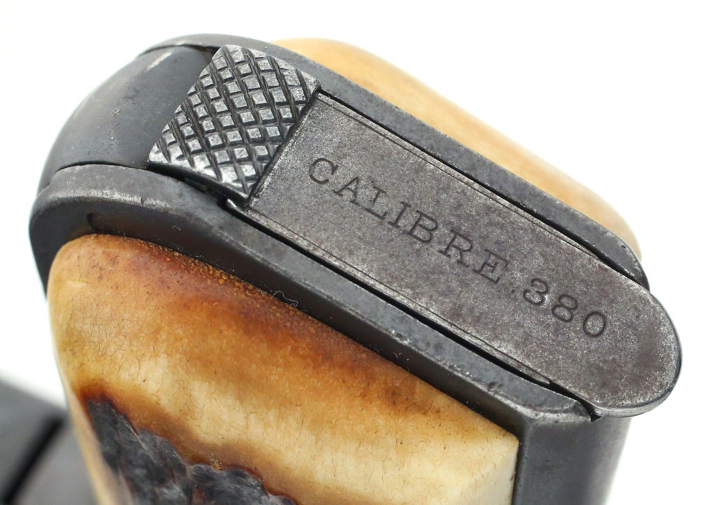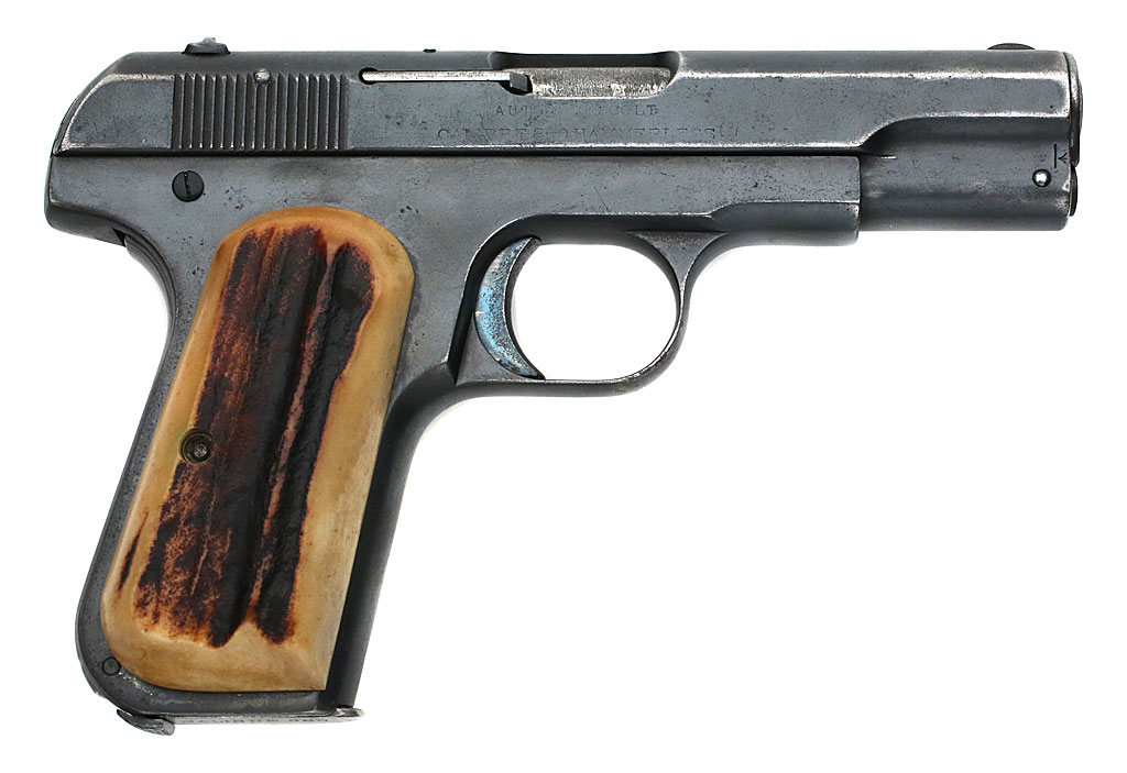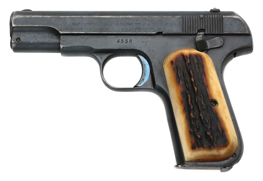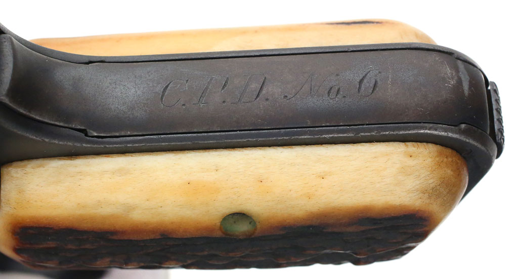 Colt 1908 Pocket Hammerless .380 ACP serial number 4559 factory inscribed "C.P.D. No. 6" on grip safety - Pistols in the serial number range 4478 - 4560 with this marking were shipped on December 22, 1909. Serial number 4559 (pictured on this page) is the consecutive serial number and the consecutive police number to serial number 4560, inscribed "C.P.D. No. 6" on grip safety (below). The stag stocks are aftermarket replacements.