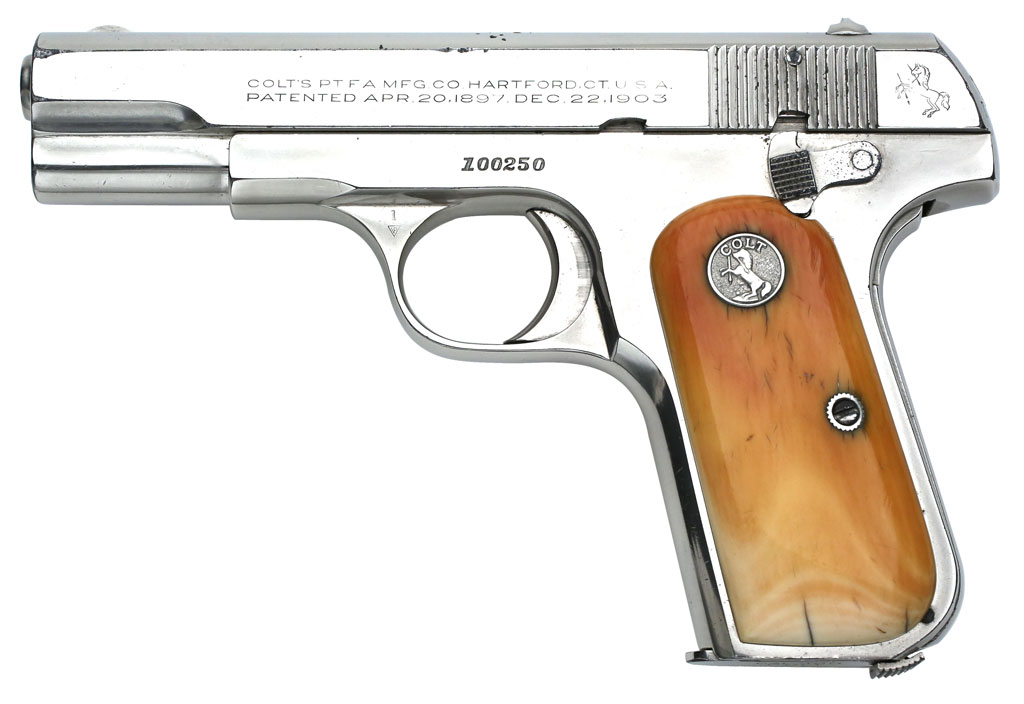 Colt Pocket Hammerless 1908 .380 ACP serial number 100250 (ca. 1928) Factory Nickel Finish and Factory Ivory Stocks with Forward Facing Flush Medallions - Right side |