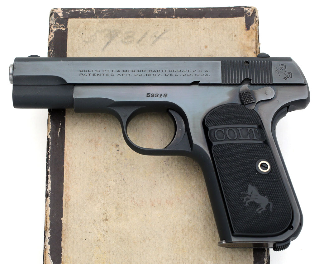 Colt Pocket Hammerless 1908 .380 ACP serial number 59314 (ca. 1921)  - sitting on top of original box numbered to the gun.